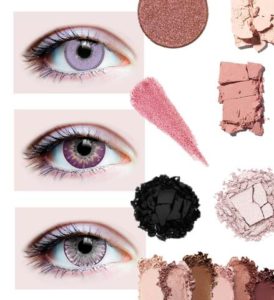 - With purple lenses, and yes our lenses are also available in lila: Pink colours, as they are pastels, will be perfect to magnify the purple of your iris, just like skin tones. But black in smokey eyes will also stand out.